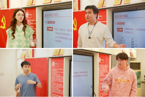 2023届部长分别介绍了各自部门的工作规划。党员发展部部长赵锦涛对本部门工作提出了两个目标:一是提升发展工作质量,二是推动党建活动开展。他详细介绍了各项工作安排,并指出要充分利用好协作工具以提升团队效能和协同合作。理论宣传部部长钱泽凯从文稿撰写、公众号运营和拍摄后期等三个方面介绍了工作规划。他还提出了一系列关于提升效率方面的想法,结合各位干事的特长,明确了组织内部分工和值班排期。活动策划部部长吴鋆分环节详细介绍了本部门的任务分工。她为大家介绍了如何举办更加贴合同学们的活动,并要充分发挥党日活动的宣传作用,同时指出举办活动前需要留有足够的准备时间。综合事务部部长陈鹏轩介绍了本部门的具体职能,并详细阐述了各项工作的具体要求和开展细节,同时明确了部门要积极配合其他部门执行具体任务,保证工作室的各项工作顺利进行。