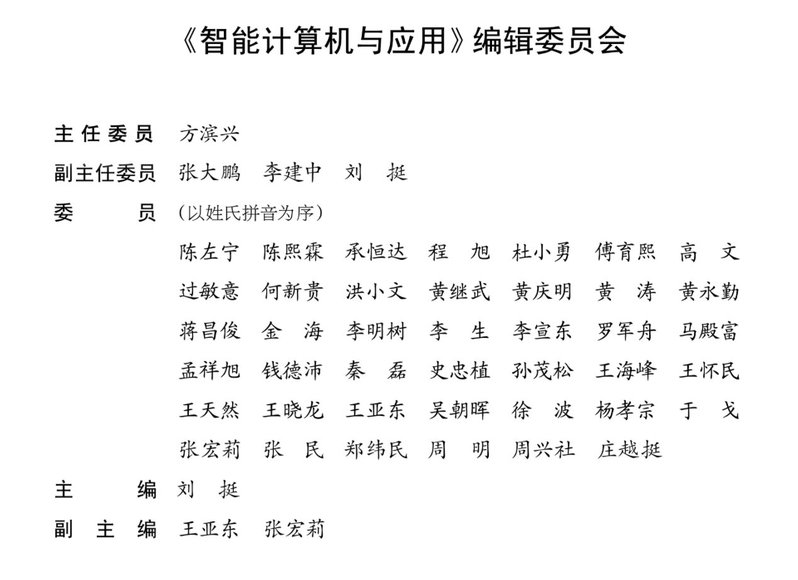 哈尔滨工业大学副校长刘挺教授担任本刊主编,45位国内外著名计算机专家和知名学者组成《智能计算机与应用》编辑委员会,对本刊进行指导、水平把关和技术支持。《智能计算机与应用》期刊现已被中国知网、万方、超星、维普等多家重要中文数据库收录。