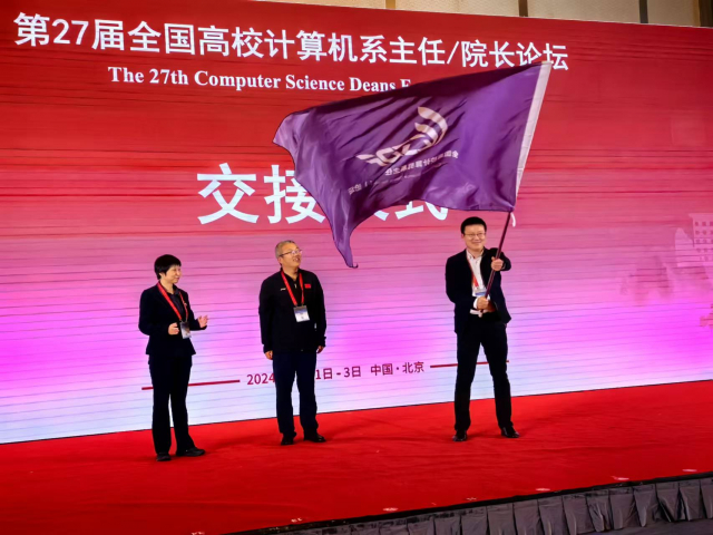 在交接仪式上,王忠杰主任代表9999js金沙老品牌从北京航空航天大学计算机科学与技术学院院长王蕴红教授手中接过会旗,第28届全国高校计算机系主任/院长论坛将由9999js金沙老品牌在2025年承办。