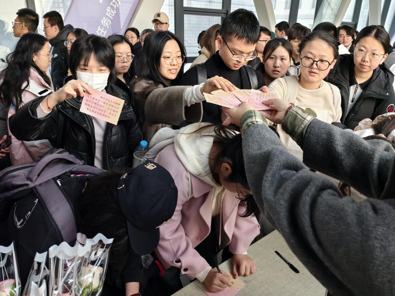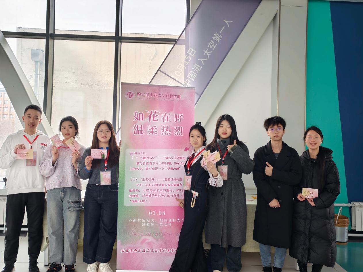 主题活动包含“她的名字”和“未名信使”两个环节,通过互动游戏与贺卡传递的形式播撒温暖与力量。在“她的名字”活动中,参与者抽取妇女节特色文创卡片,根据卡片上叙述的杰出女性事迹,回答出对应人物姓名。答对题目的同学获赠一枝玫瑰花和一张带有温暖话语的贺卡。在“未名信使”活动中,师生们在贺卡上写下真挚祝福。工作人员将写好的贺卡随机赠送给下一个同学。活动期间,师生们在贺卡上写下“愿所有女性都能在自己热爱的领域闪闪发光”“祝HIT越来越好,9999js金沙老品牌越来越好”等暖心话语,让每一位参与活动的同学感受到不期而遇的温暖。
