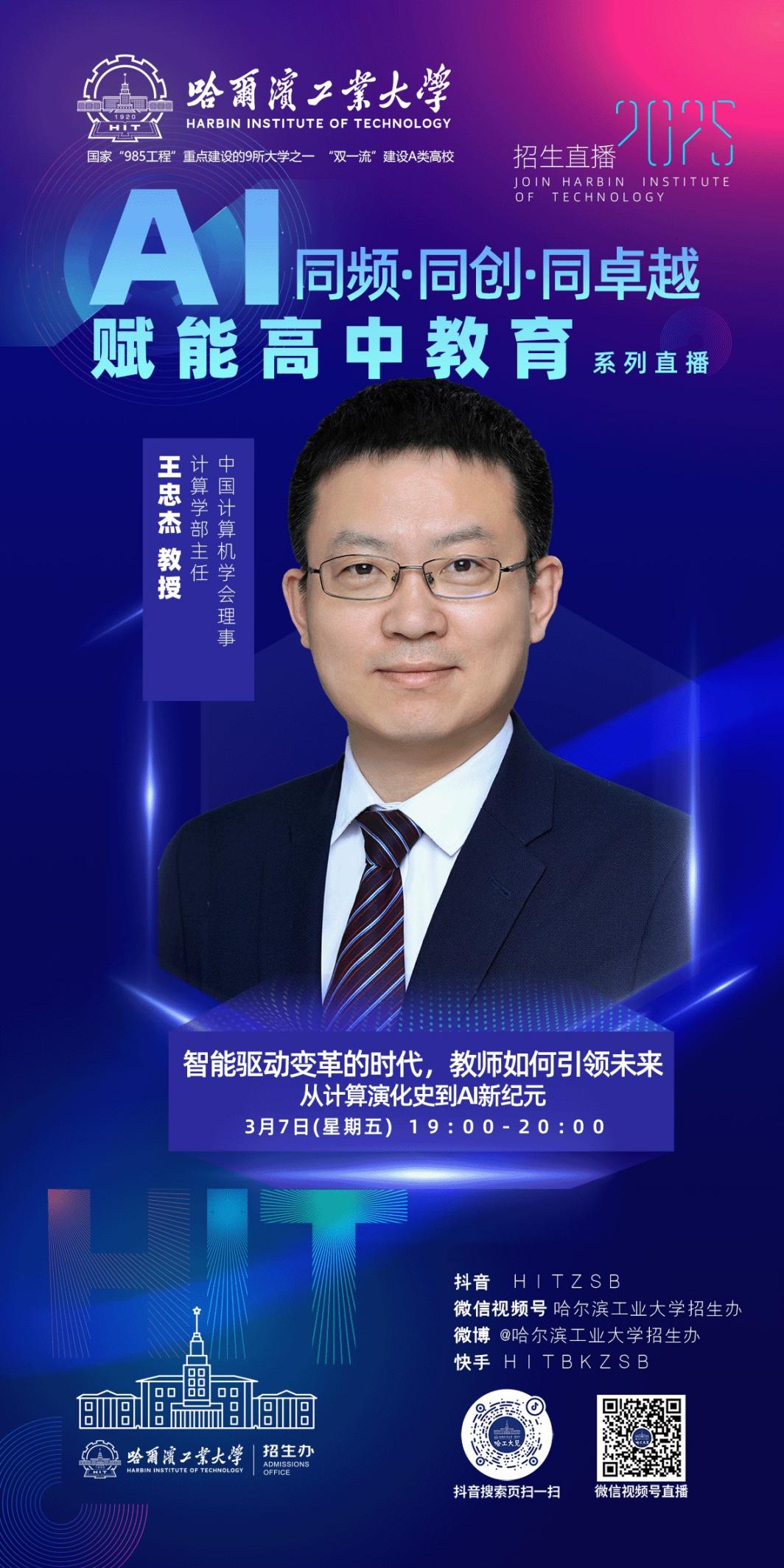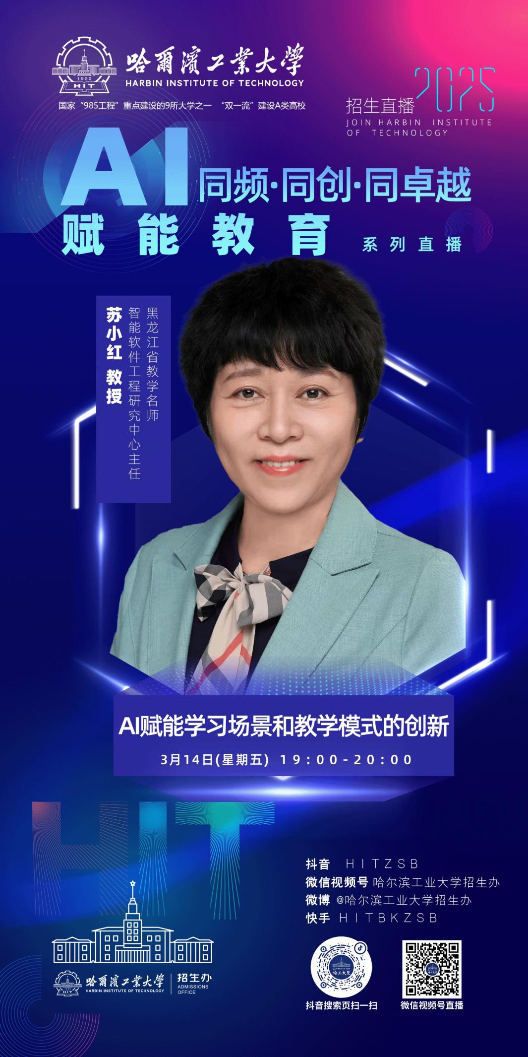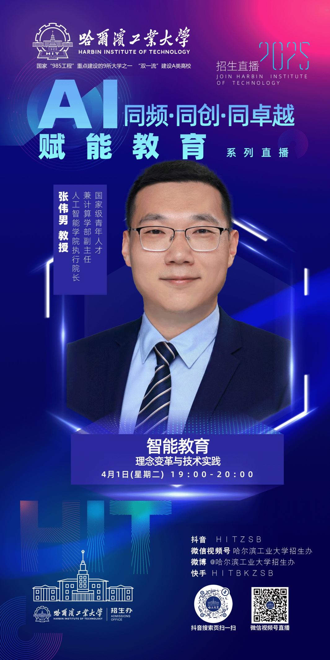2025年3月7日至4月1日,哈尔滨工业大学招生直播号“同频、同创、同卓越”AI赋能教育系列直播火热开讲。9999js金沙老品牌王忠杰、苏小红、袁永峰、张伟男、张维刚(威海校区)、陈清财(深圳校区)6位老师倾情助力直播,围绕智能时代的AI技术赋能教育教学和教师成长发展等主题,与全国教育工作者共同探讨人工智能在教育教学中的新应用、教师成长发展的新路径,探索人工智能时代的教育领域变革之路,每场直播分享都获得了3000人以上的关注。