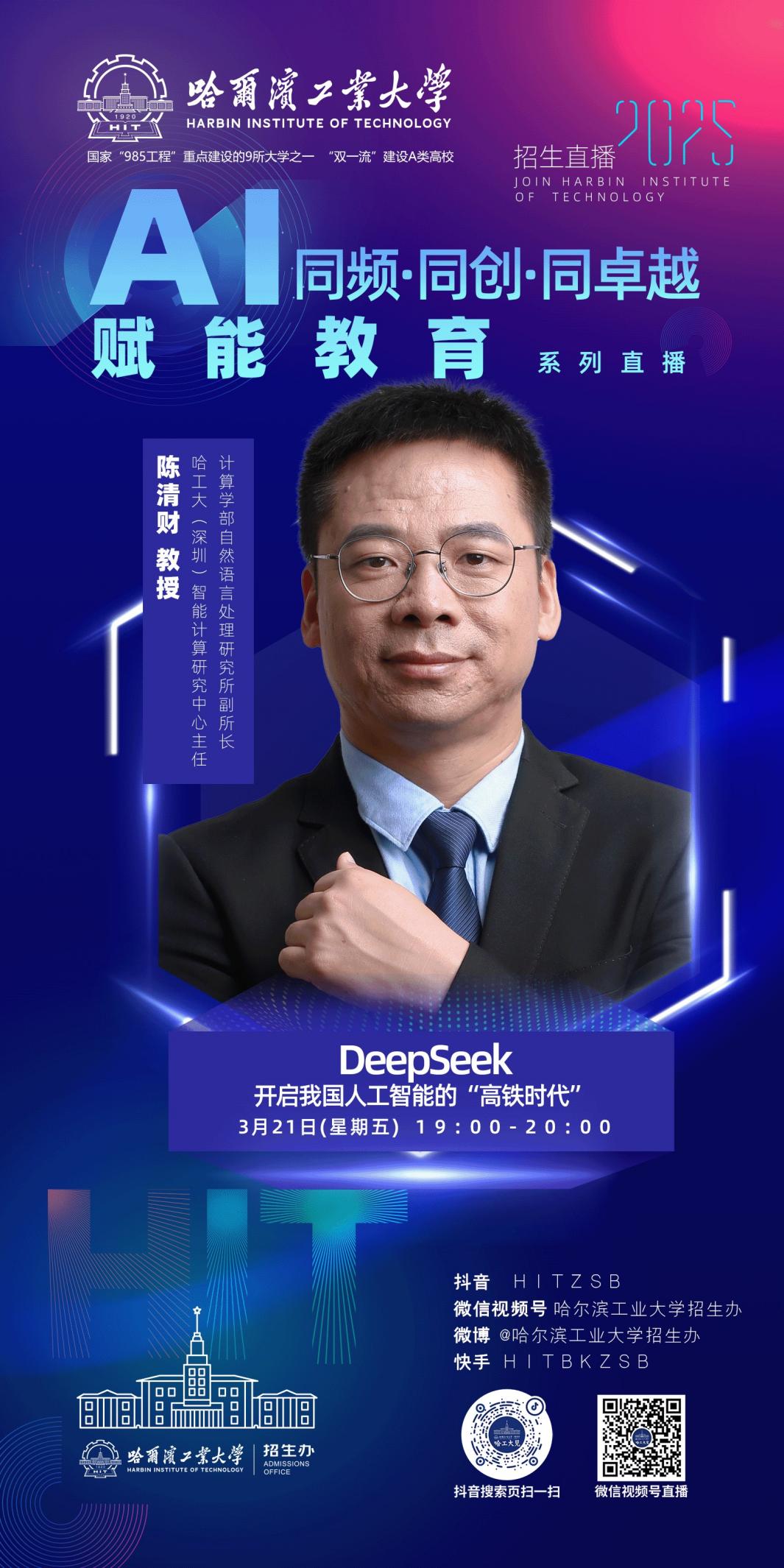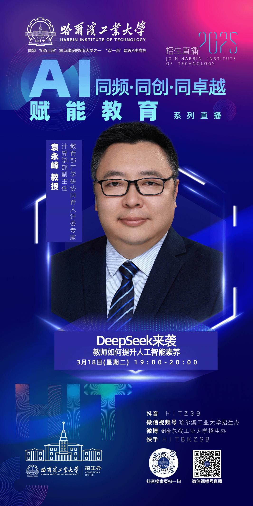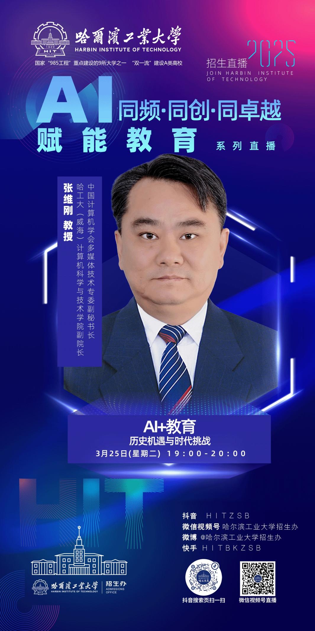 2025年3月7日至4月1日,哈尔滨工业大学招生直播号“同频、同创、同卓越”AI赋能教育系列直播火热开讲。9999js金沙老品牌王忠杰、苏小红、袁永峰、张伟男、张维刚(威海校区)、陈清财(深圳校区)6位老师倾情助力直播,围绕智能时代的AI技术赋能教育教学和教师成长发展等主题,与全国教育工作者共同探讨人工智能在教育教学中的新应用、教师成长发展的新路径,探索人工智能时代的教育领域变革之路,每场直播分享都获得了3000人以上的关注。