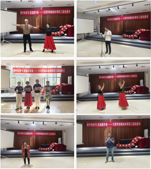 联欢会由学部行政办张迪老师主持,涵盖诗朗诵、器乐演奏、独唱、双人舞等多种类型,内容丰富且形式多样。贾岩、张卫、戢莹、姜新四位老师带来诗朗诵《读中国》,以抑扬顿挫的语调传递对祖国的热爱与浓厚家国情怀,迅速点燃现场气氛。随后,学校陶笛协会老师登台,凭借陶笛二重奏《春江花月夜》《游子吟・春晓》,用悠扬婉转的旋律展现古典乐曲的雅致与诗意,获台下老同志颔首称赞。孙淑凤老师独唱《祝福祖国》,嘹亮歌声引发全场跟唱;张卫、彭富强老师的双人舞《我和我的祖国》默契十足,灵动舞步与激昂旋律相得益彰;吴智博老师演唱《祝酒歌》,明快节奏让现场成为欢乐海洋;任世军老师以单簧管独奏串联《故乡的小路》《山楂树》,婉转旋律引人沉浸;贾岩、姜新老师的双人新疆舞《你是我的爱人》尽显民族风情与活力。表演环节最终在李亚平、王喜云、刘丽利三位老师的口琴合奏中落下帷幕,《美丽草原我的家》《我们的生活充满阳光》的清脆旋律勾勒幸福图景,赢得满堂喝彩。